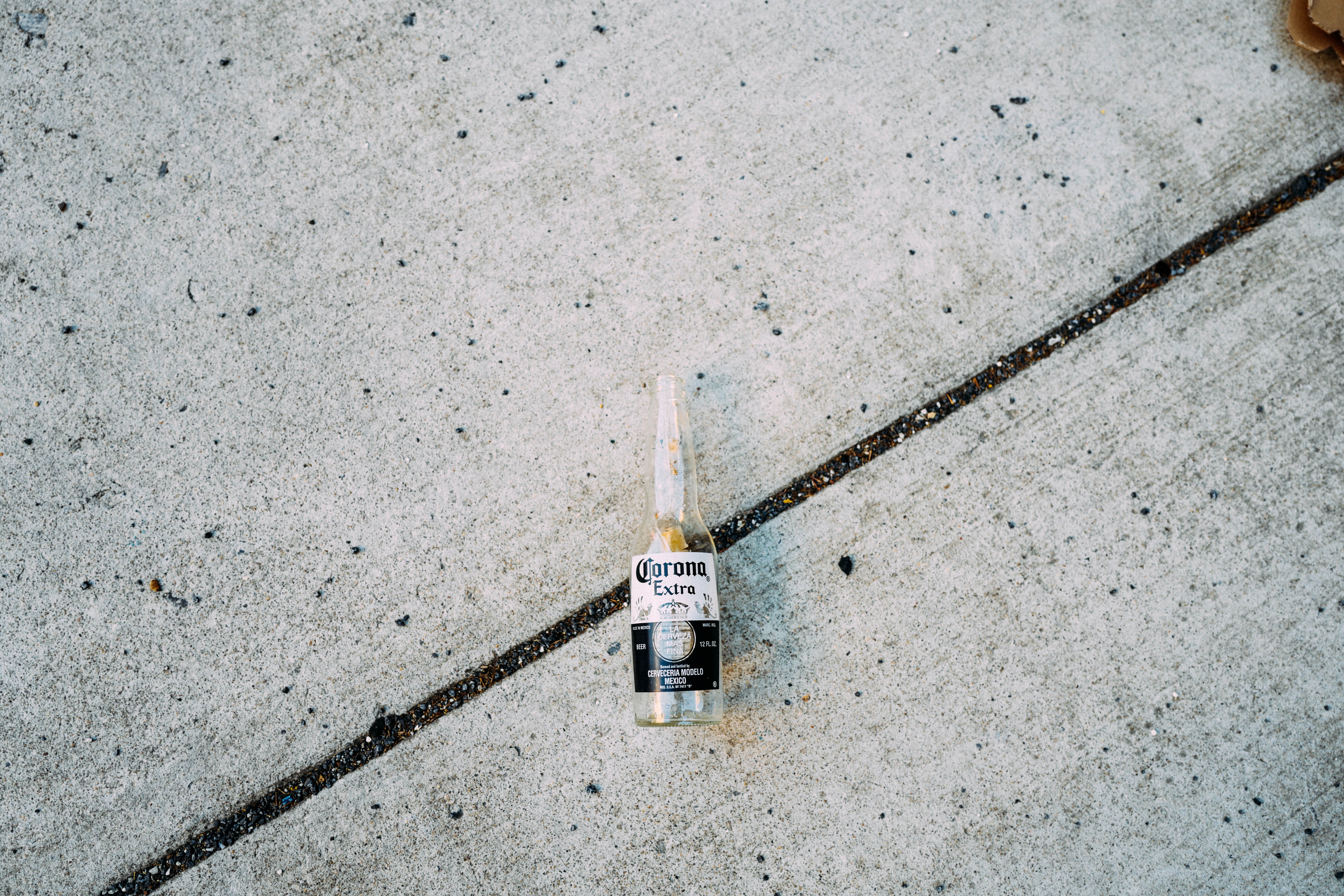 A lone Corona beer bottle lies abandoned on a textured concrete surface, accentuated by sharp lines that draw the eye. The play of soft natural light creates subtle reflections on the bottle, highlighting its emptiness against the gritty backdrop. The scene evokes a sense of nostalgia and fleeting moments of summer relaxation, now captured in stillness.
