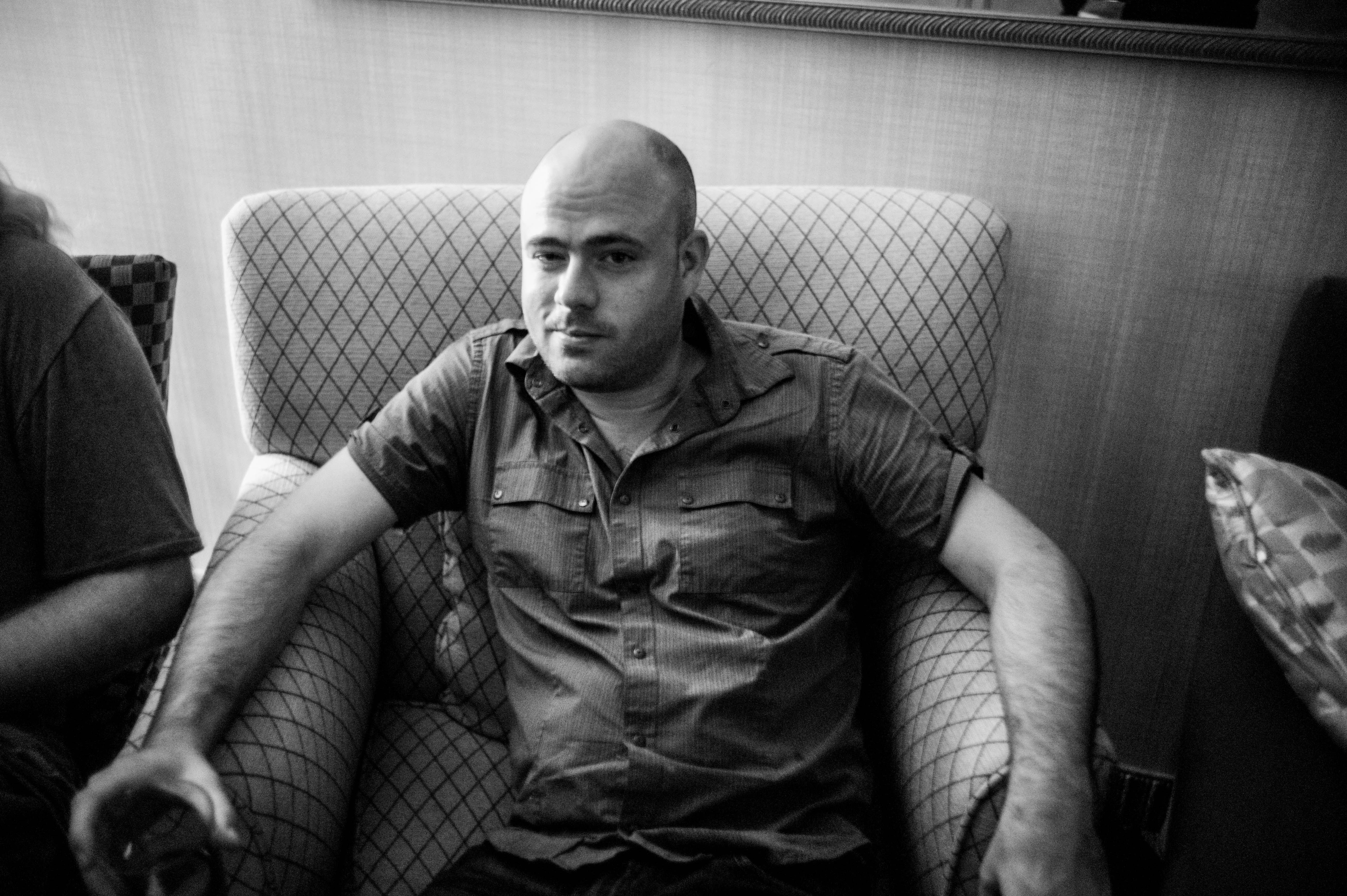 In this black and white photograph, a man sits comfortably in a patterned armchair, exuding a relaxed yet introspective mood. The soft lighting enhances the subtle expressions on his face, capturing a moment of quiet contemplation amidst the soft textures of the surrounding décor. The composition draws the viewer's eye to his expression, while the blurred figures nearby suggest a casual, intimate setting.