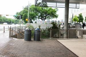 This photograph captures a calm urban scene under a gray sky, where modern architecture meets lush greenery. The muted lighting enhances the tranquil atmosphere, while the prominent, stylish signage adds an element of contemporary design. The composition, with pathways and greenery framing the view, invites the observer to pause and reflect on the interplay between nature and urban life.