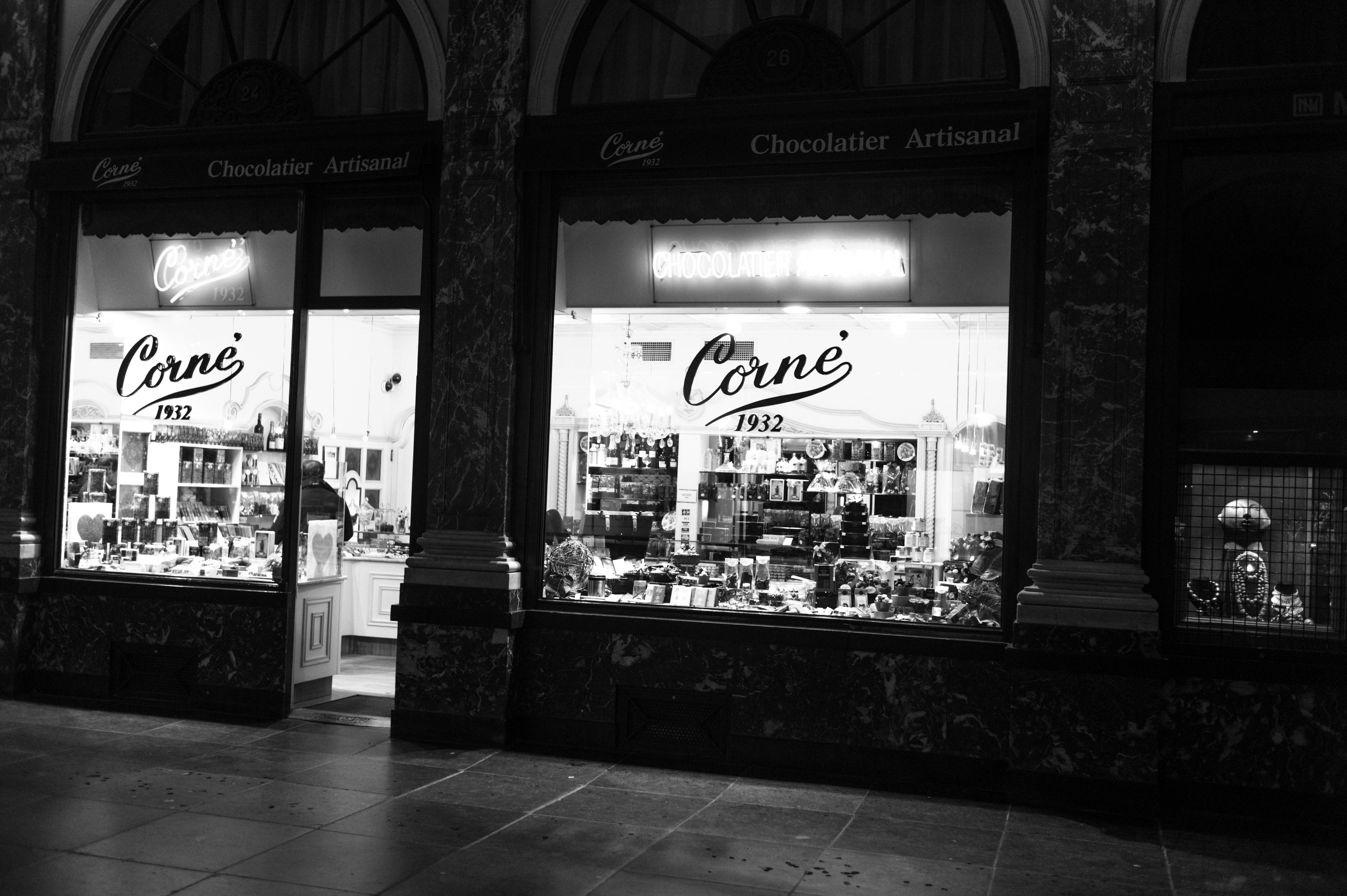 The photograph captures the inviting window display of Corné, a chocolatier, illuminated against the evening's darkness. The contrast of the soft, warm light inside highlights an array of tempting treats, while the black and white tones evoke a sense of nostalgia and classic charm. The composition draws the viewer’s eye to the elegant signage, encapsulating the allure of artisanal craftsmanship.