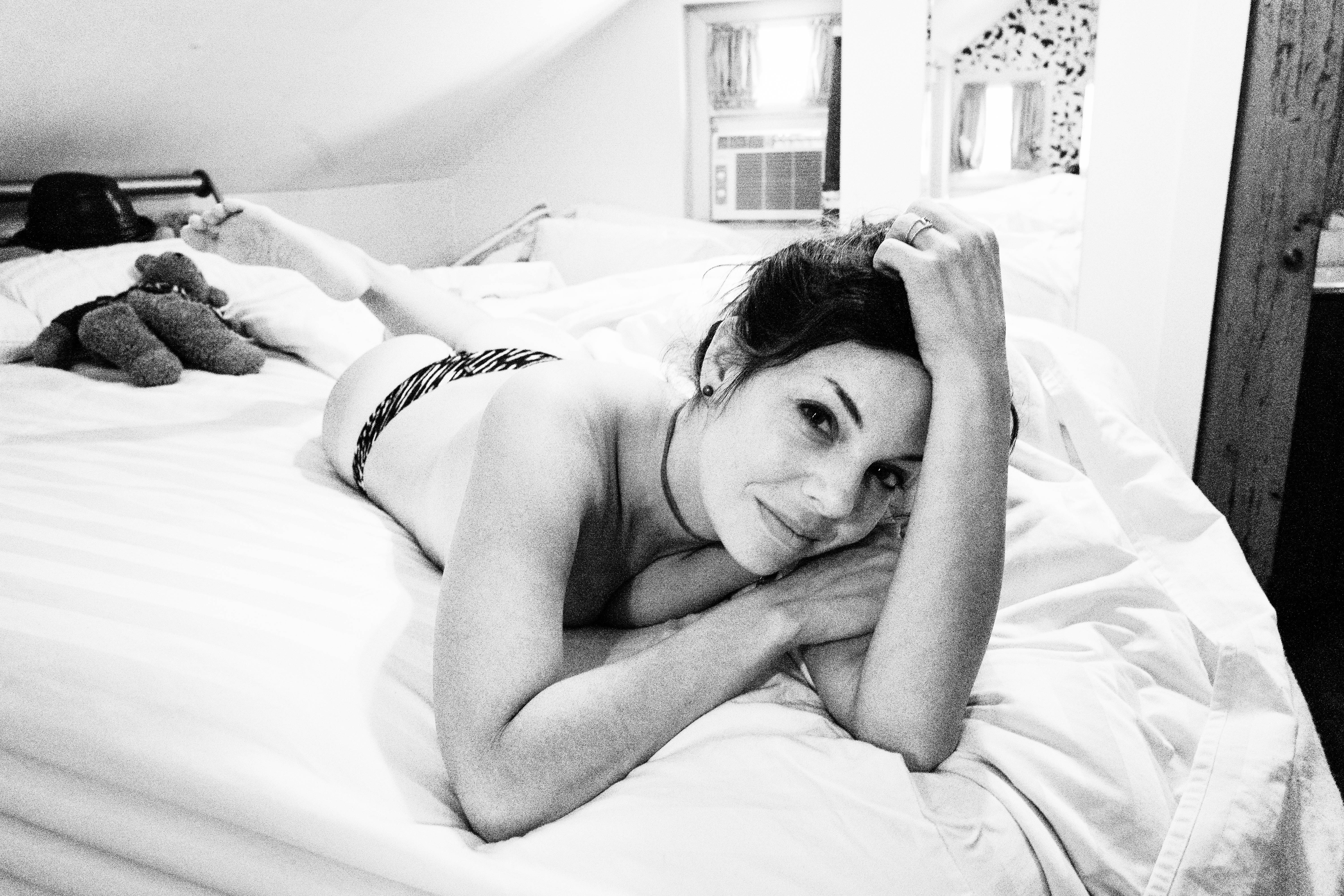 In a softly lit attic room, a woman lounges on bed linens, exuding both relaxation and contemplation. Her gaze meets the camera with a playful yet serene expression, framed by her tousled hair that contrasts the stark white of her surroundings. The monochromatic palette enhances the intimate mood, capturing a moment of quiet introspection amid hints of nostalgia, like the teddy bear beside her.