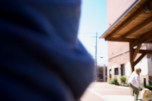 In this intriguing photograph, the focus is lost, creating an abstract image where a blurred figure dominates the left side, while a glimpse of a person with a dog appears in the background, suggesting a casual afternoon scene. The bright blue sky and warm sunlight contribute to a lighthearted mood, even amidst the blurriness that adds a layer of mystery to the composition.