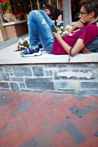 In this candid street scene, a young man lounges on a stone ledge, absorbed in his phone, exuding a relaxed yet contemplative mood. The soft evening light gently illuminates his face and the surrounding flowers, creating a warm, inviting atmosphere. Blurred figures in the background add depth, hinting at the life swirling around him while he remains in his own world.