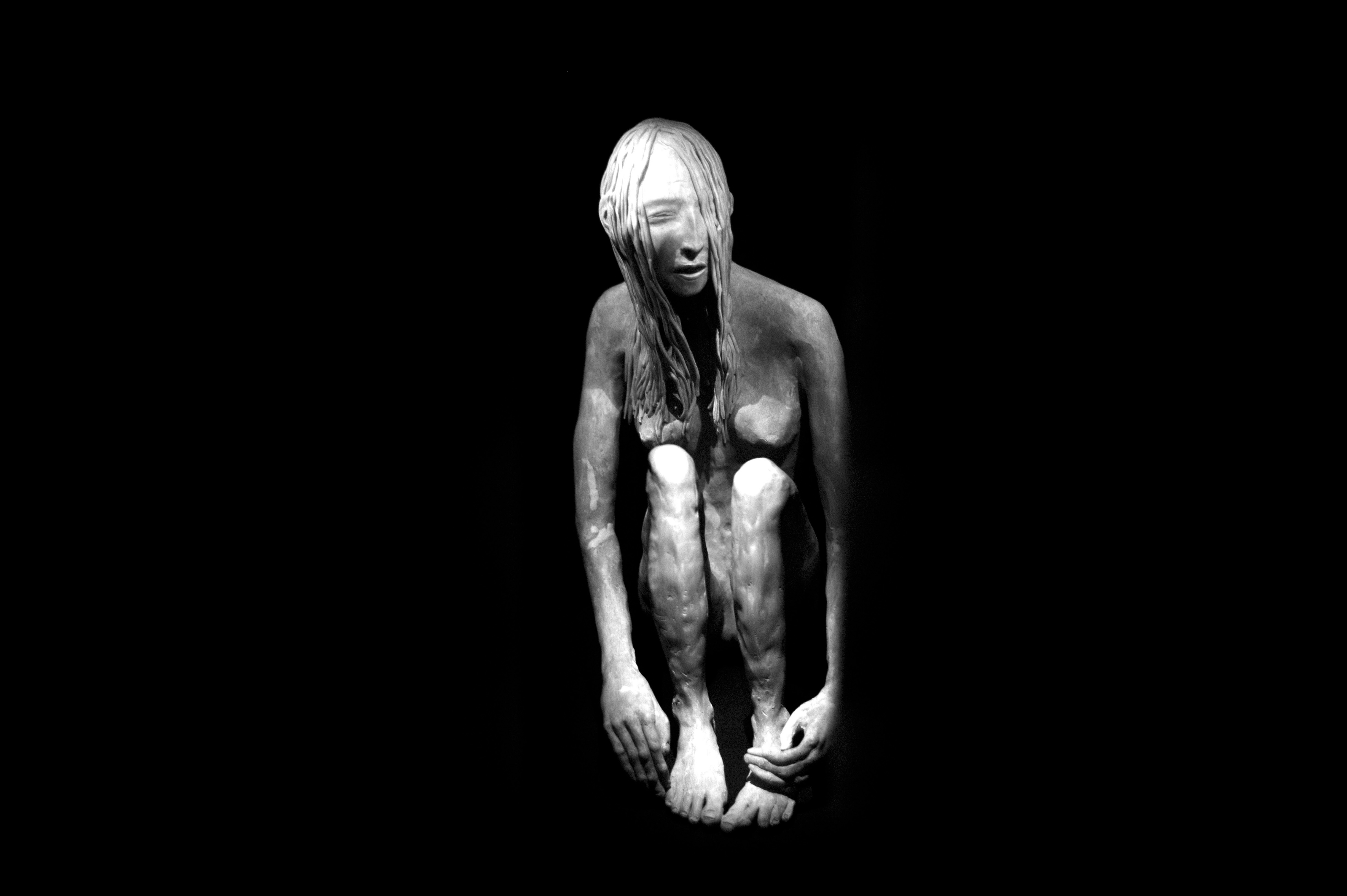 This striking monochrome photograph features a crouched figure, enveloped in shadows and illuminating the raw, emotional vulnerability of the subject. The figure's expression, combined with the stark, dramatic lighting, creates an atmosphere of deep introspection and unease. The contrast between the dark background and the pale, sculptural form heightens the sense of isolation and somber reflection.
