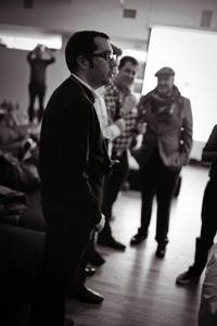 In a softly lit room, a group of men are engaged in lively conversation, their faces animated and expressions warm. The foreground features a man in glasses, slightly turned, embodying a thoughtful presence amidst the camaraderie. The overall mood is nostalgic and intimate, enhanced by the monochrome palette that evokes a sense of connection and shared moments.