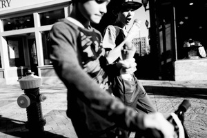 This black-and-white photograph captures two boys on a sunlit street, embodying youthful energy and carefree joy. One boy, focused on his bike, while the other excitedly holds an ice cream cone, creates a dynamic composition with balance and movement. The high contrast of light and shadow evokes a nostalgic mood, reminiscent of warm spring afternoons spent outdoors.