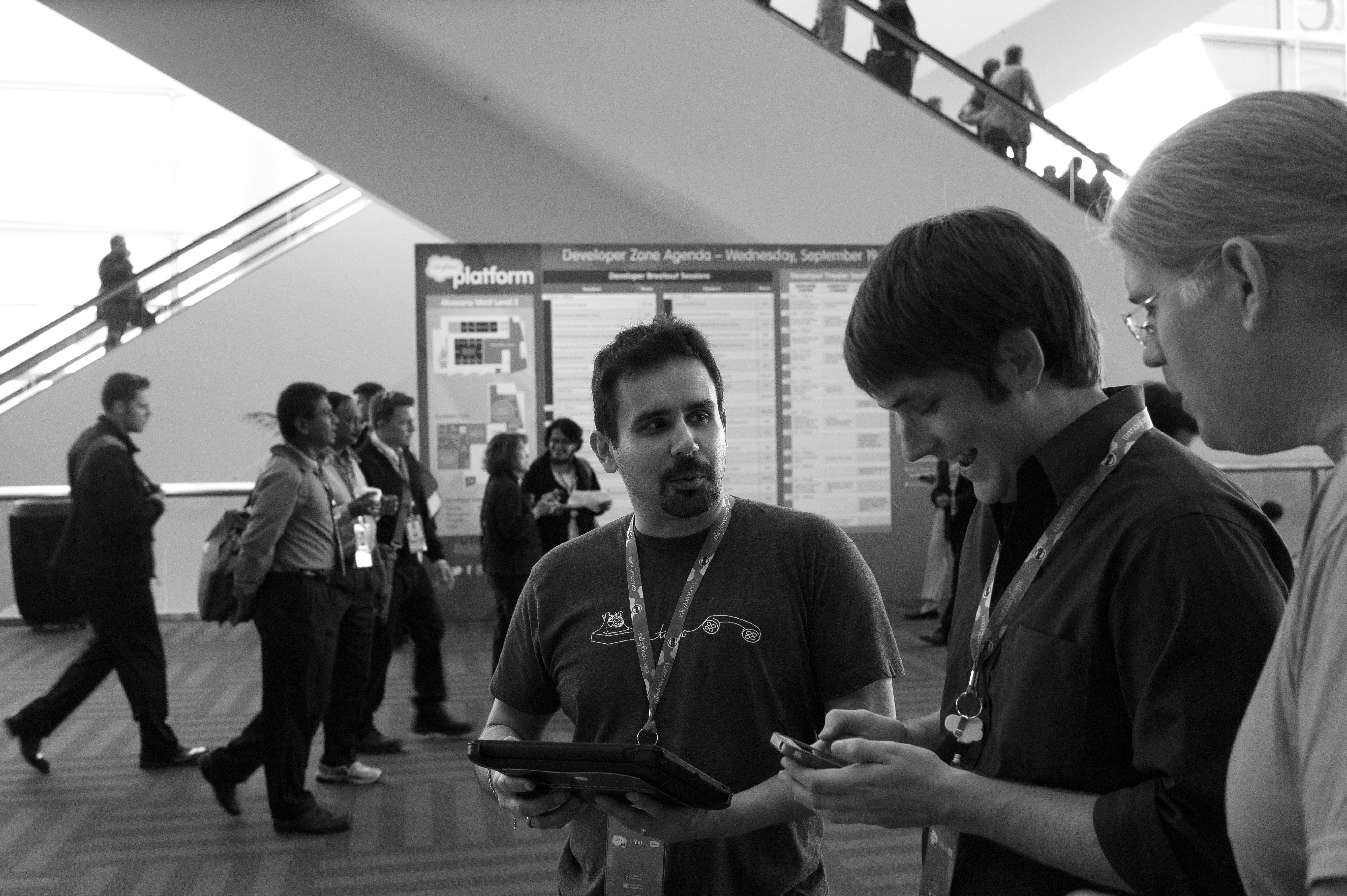 In a bustling conference environment, three individuals are deeply engaged in discussion, showcasing collaboration and creativity. The black-and-white composition adds a timeless quality, while the soft, diffused lighting enhances the focus on their animated expressions. A backdrop of fellow attendees moving about signals the lively atmosphere of knowledge sharing and innovation.