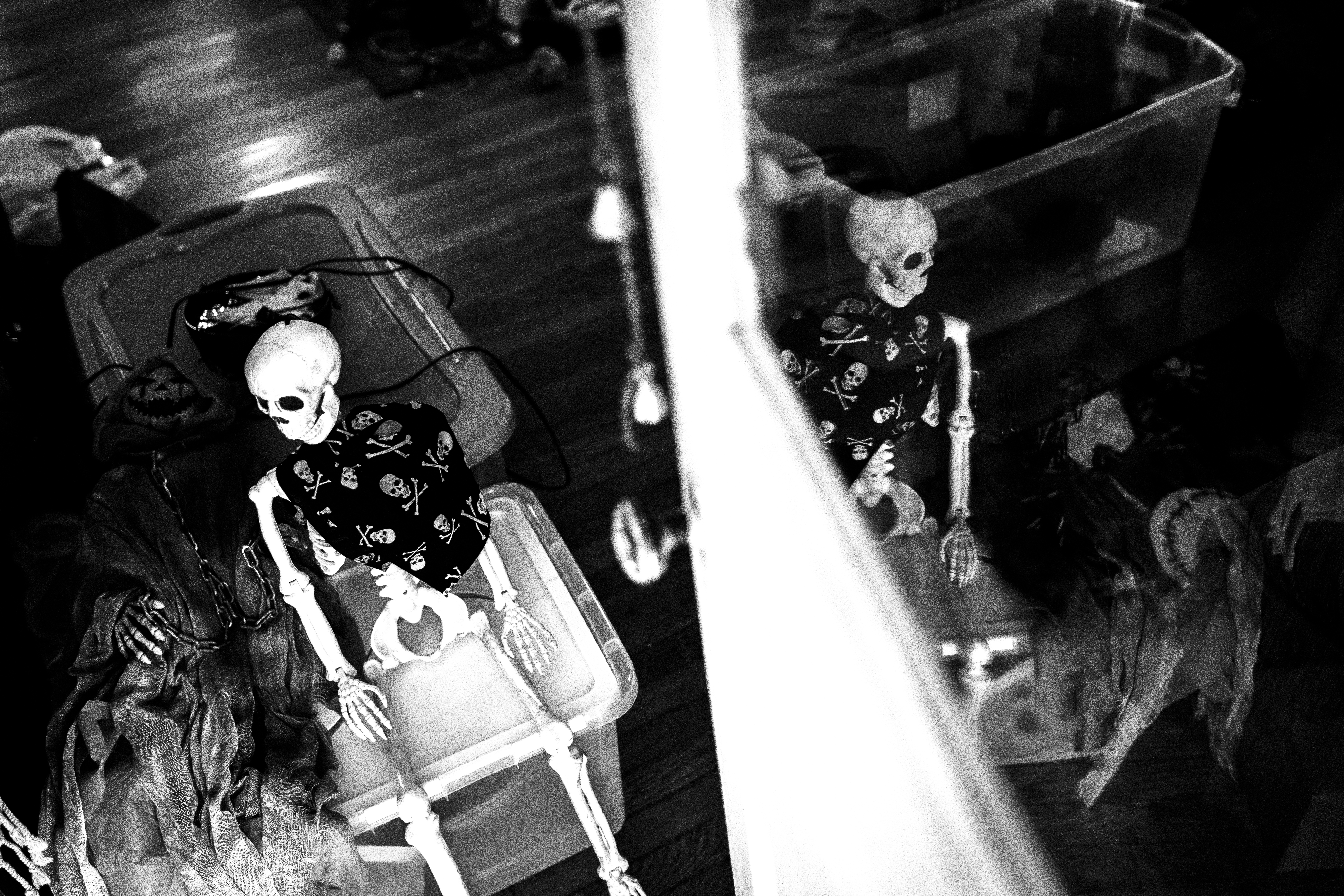 The photograph captures a whimsical yet eerie scene featuring a skeleton clad in a pirate-themed shirt, seated casually in a plastic bin. The muted black-and-white tones emphasize the stark contrast between the skeletal figure and its cluttered surroundings, adding a touch of surrealism. Reflections in the glass create an intriguing interplay of depth and perspective, enhancing the overall mood of playful spookiness.