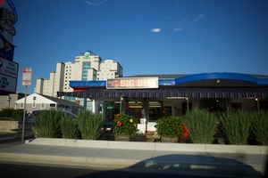 The photograph captures a charming diner, 'Home of the Big Bee,' nestled in the foreground against a backdrop of modern architecture. Vibrant flowers and neatly arranged greenery evoke a welcoming atmosphere, illuminated by bright, early sunlight. This juxtaposition of nostalgic Americana against contemporary urban life creates a serene yet lively mood, inviting passersby to stop and enjoy.