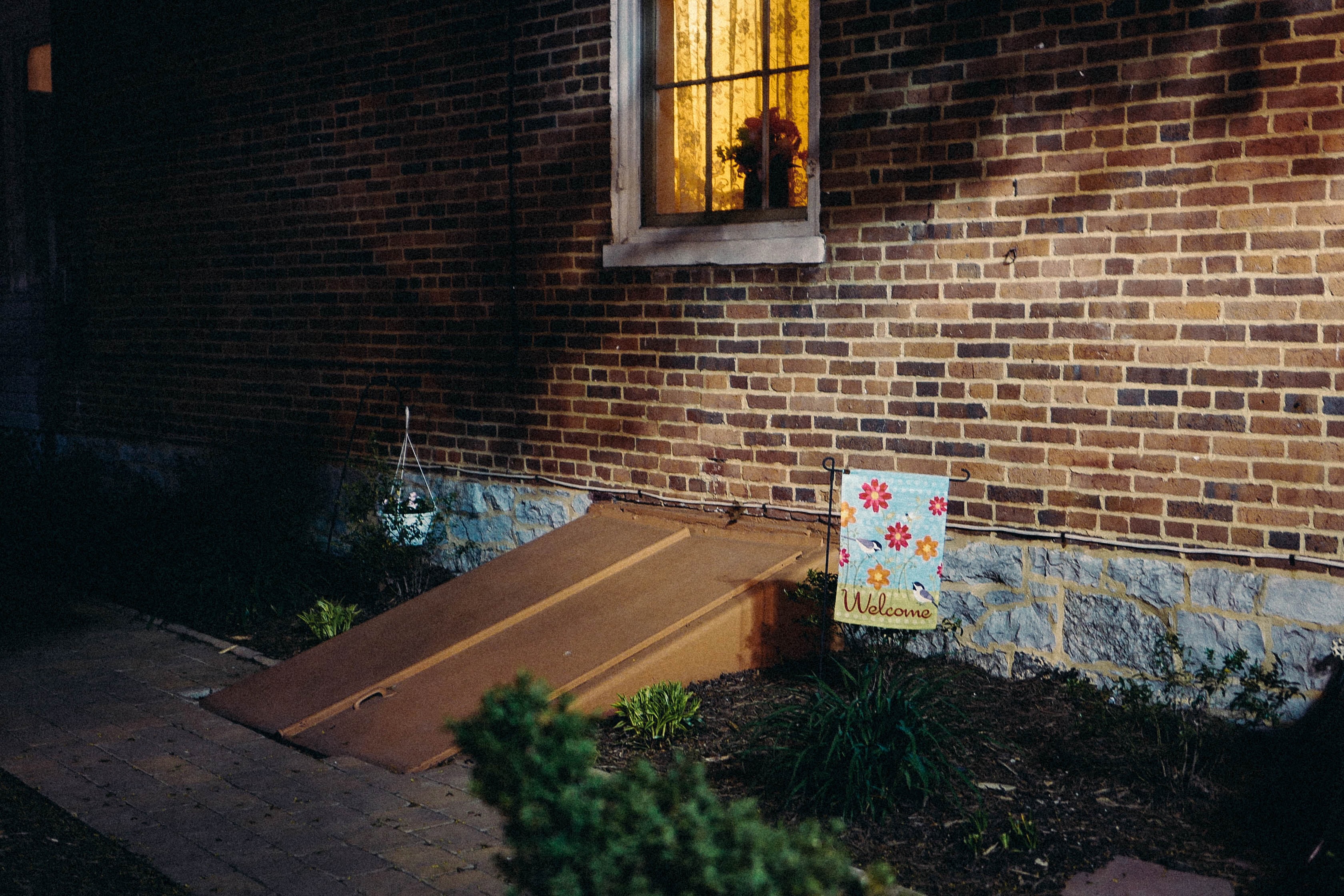 This photograph captures a warm, inviting scene at night, highlighting a brick wall illuminated by the soft glow from a window. A colorful 'Welcome' sign rests beside a wooden ramp, creating a sense of accessibility and hospitality. The gentle contrasts in lighting evoke a cozy atmosphere, suggesting warmth and comfort amidst the darkness of the surroundings.