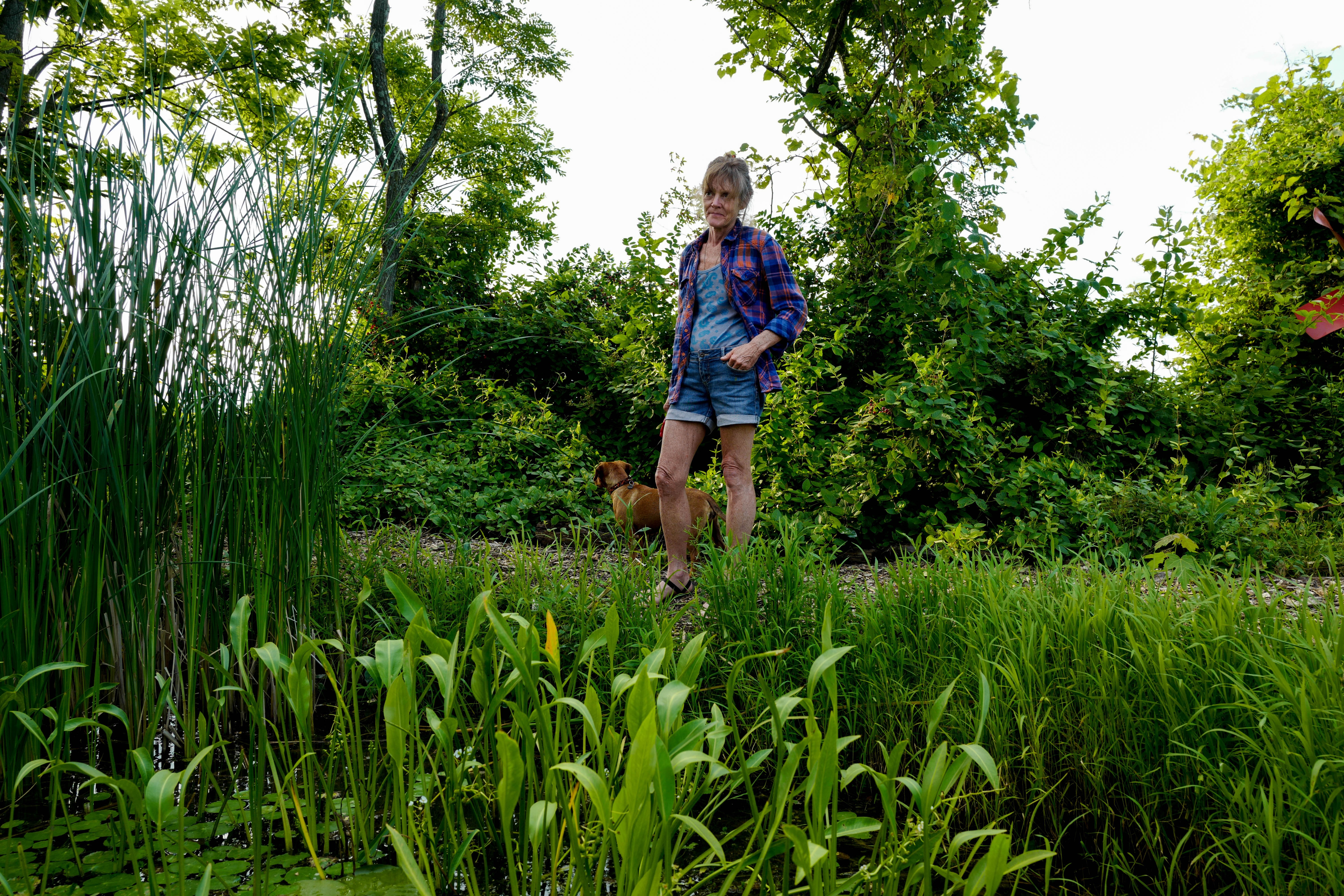 A woman in a plaid shirt and denim shorts walks along a bank surrounded by lush greenery, accompanied by a small dog. The soft light filters through the trees, creating a tranquil atmosphere that captures a moment of harmony with nature. The vibrant greens of the foliage and water plants evoke a sense of peace and connection to the outdoors.