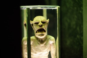 This striking photograph features a grotesque figure encased in glass, exuding a palpable tension. The eerie green lighting casts an ominous glow, enhancing the unsettling expression of rage and despair on the creature's face. The composition draws the viewer's gaze directly to the figure, creating a claustrophobic and unsettling mood.