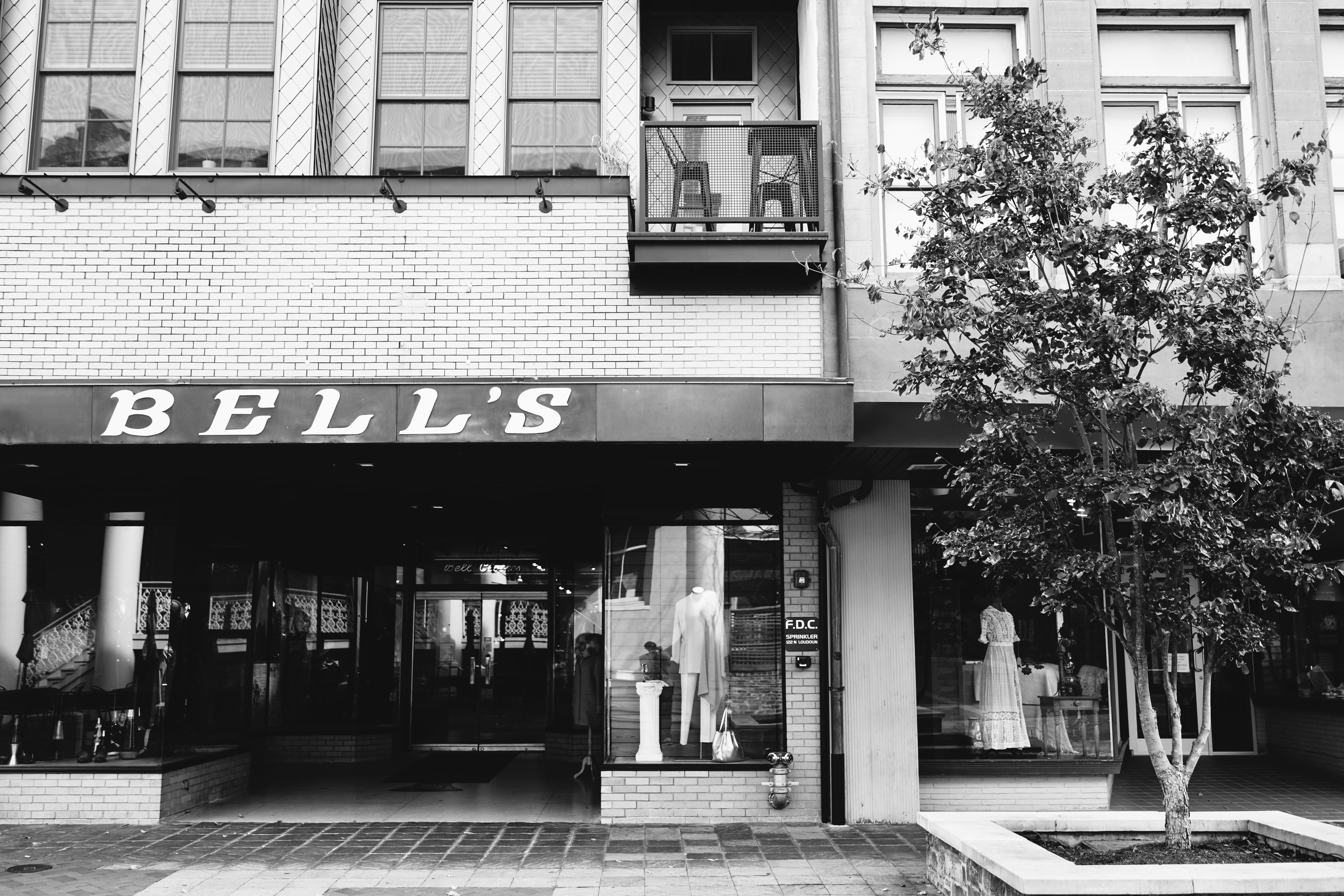 This photograph captures the charming storefront of 'BELL'S' in a quiet urban setting, evoking a sense of nostalgia. The composition features a crisp contrast between the inviting black façade and the warm brick tones, while natural light softly illuminates the displays inside. Subtle details, like the two empty chairs on the balcony and the small tree in the corner, add a touch of life and serenity to the scene.