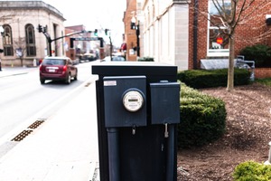 The photograph captures an unassuming utility box in the foreground, set against a blurred backdrop of a quiet street scene. Soft, diffused lighting enhances the muted colors of the surroundings, lending a calm and serene mood. The composition draws the eye toward the urban details, reflecting the often-overlooked aspects of city life.