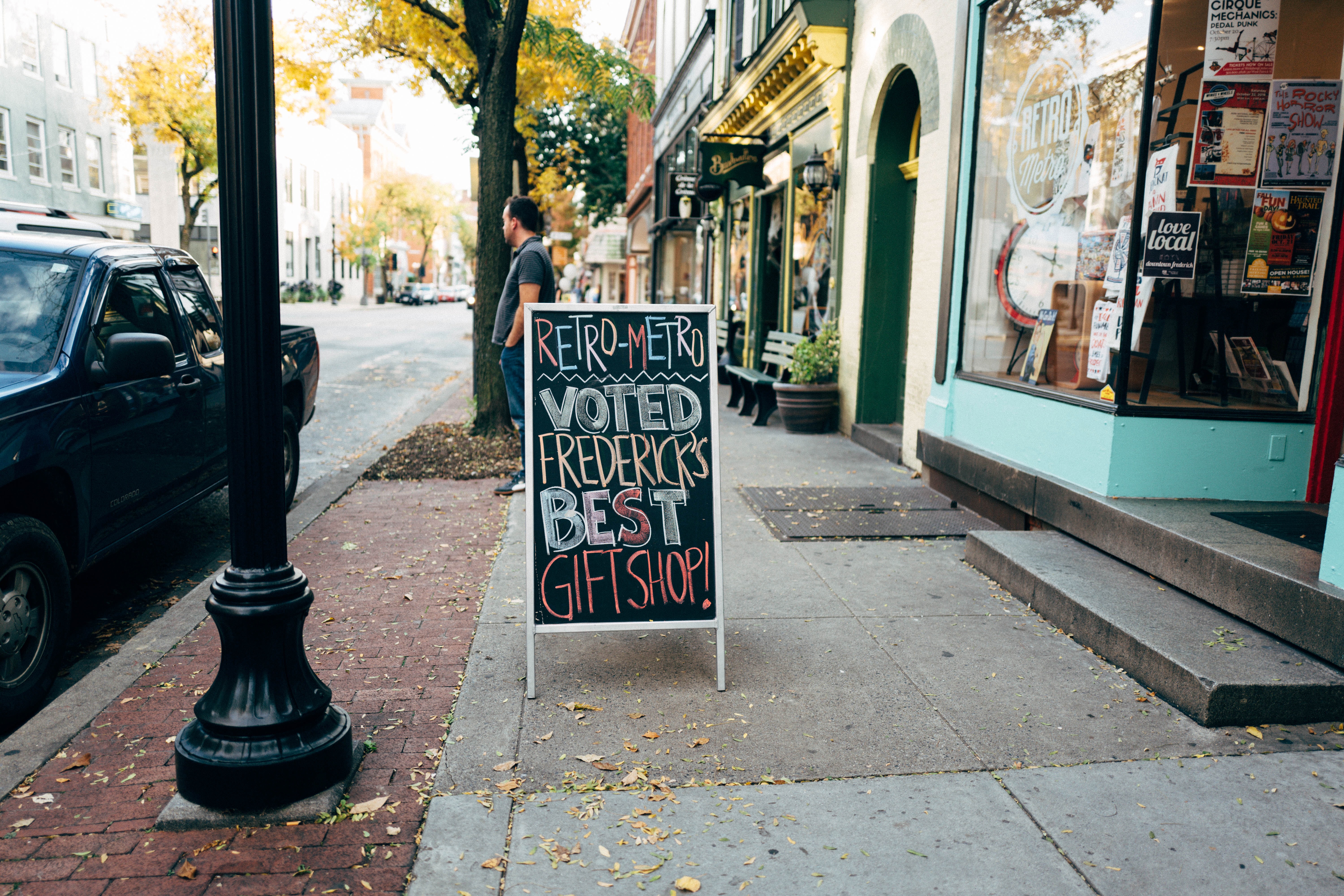 A vibrant sidewalk scene captures the essence of a local gift shop, adorned with a colorful sign proclaiming its popularity. The warm autumn light casts a cozy glow, enhancing the inviting ambiance as a figure casually leans against a lamp post, lost in thought. The autumn leaves are tinged with gold, reflecting a sense of community and seasonal charm.