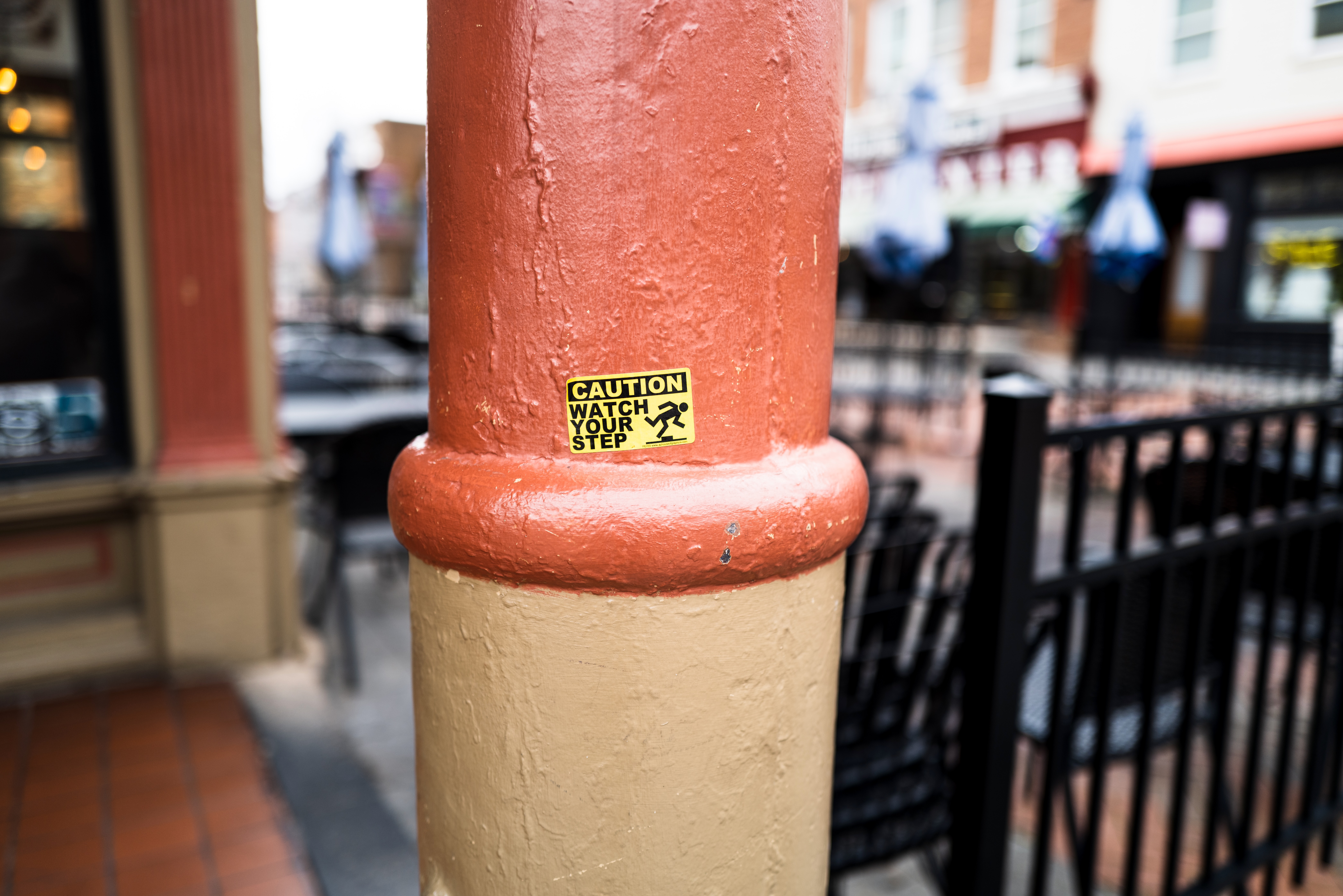 A close-up view of a vibrant, painted pole adorned with a bright yellow caution sign reading 'WATCH YOUR STEP.' The composition highlights the contrast between the warm tones of the pole and the cool, muted background of an empty outdoor café, evoking a sense of solitude and alertness in an urban environment. Soft, diffused lighting adds a contemplative mood, emphasizing the cautionary message in an everyday setting.