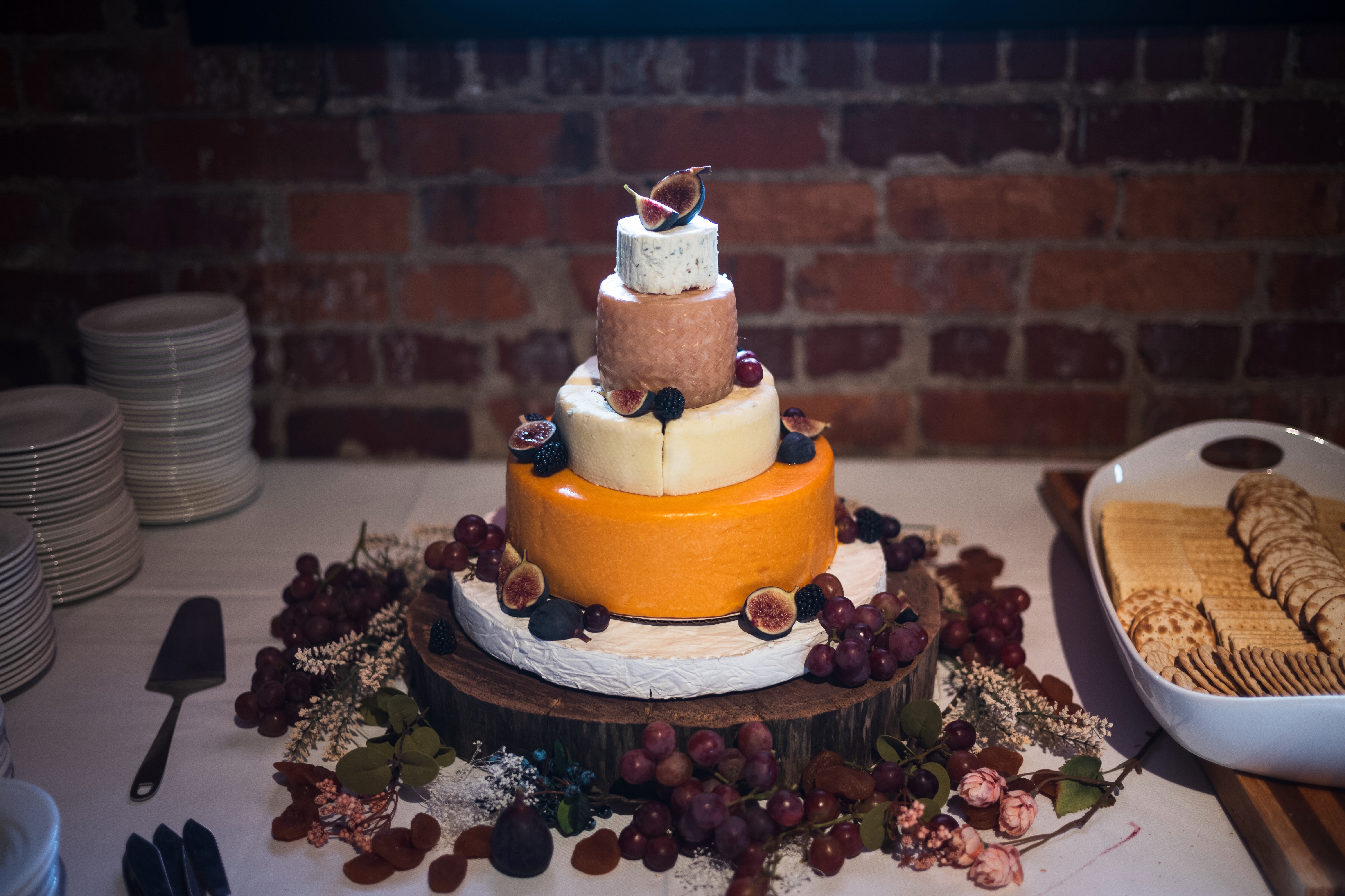 A stunning display of assorted cheeses stacked elegantly on a wooden board, surrounded by fresh grapes and delicate florals. The warm, soft lighting casts a cozy glow, enhancing the inviting mood of the scene. In the background, simple white plates and a dish of crackers complement the gourmet arrangement, creating an intimate atmosphere perfect for gatherings.