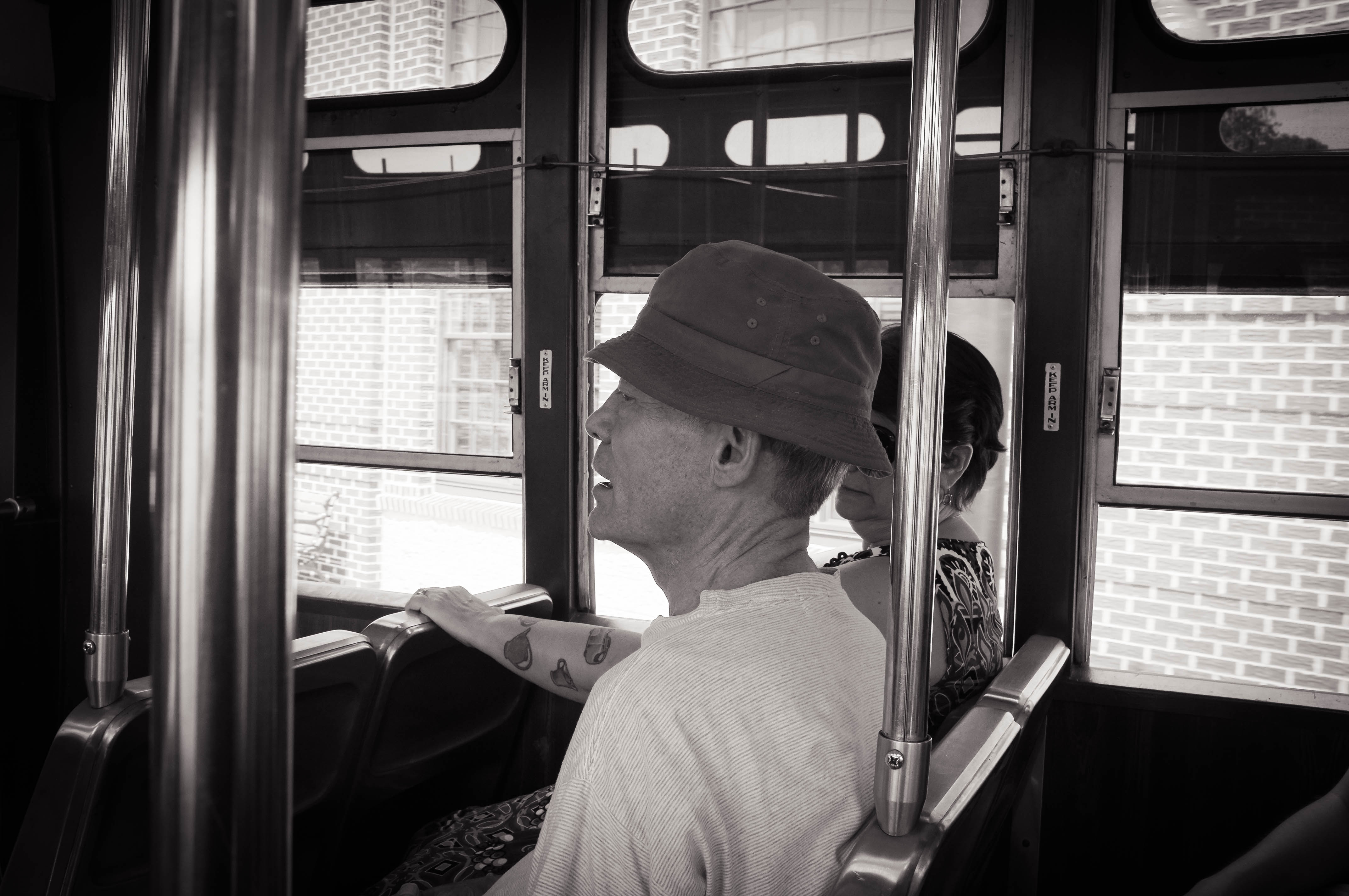 In this black-and-white photograph, an older man with a hat gazes intently out of a bus window, capturing a moment of quiet contemplation. The interplay of light and shadows creates a nostalgic mood, accentuated by the textured surfaces of the bus interior. With sleek lines and the presence of another passenger just out of focus, the composition invites viewers into a shared experience of urban travel.