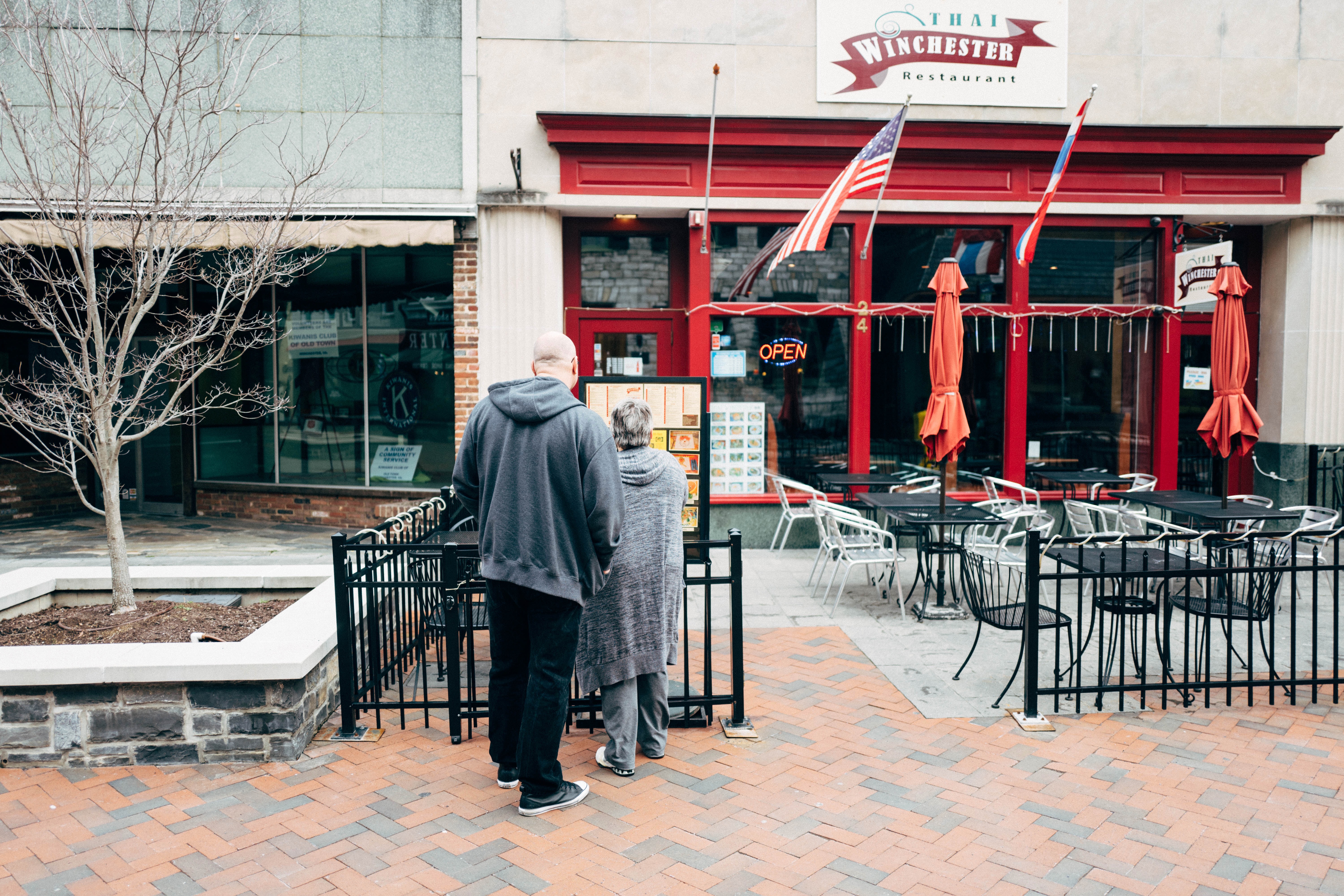 The photograph captures a serene moment as a couple stands closely together, peering at the menu outside a Thai restaurant. The muted tones and soft light evoke a sense of understated warmth, while the surrounding empty tables hint at anticipation and intimacy. The simplicity of the composition, framed by the contrasting red and neutral hues, draws the viewer into their shared experience.