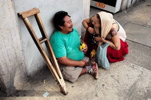 In an engaging street scene, a man seated against a wall shares a warm smile with a woman crouched beside him, creating a tangible sense of connection. The vibrant colors of their clothing and the thoughtful details in their expressions contrast with the urban backdrop, evoking a mood of empathy and shared humanity. Soft, natural light highlights their features, enhancing the intimacy of this candid moment.