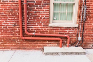 This photograph captures a striking contrast between industrial piping and a weathered brick wall. Soft, natural light highlights the rusty reds of the pipework, creating a warm yet gritty atmosphere. The clean lines of the pipes draw the eye towards the window, inviting contemplation about the intersection of utility and aesthetics in urban environments.