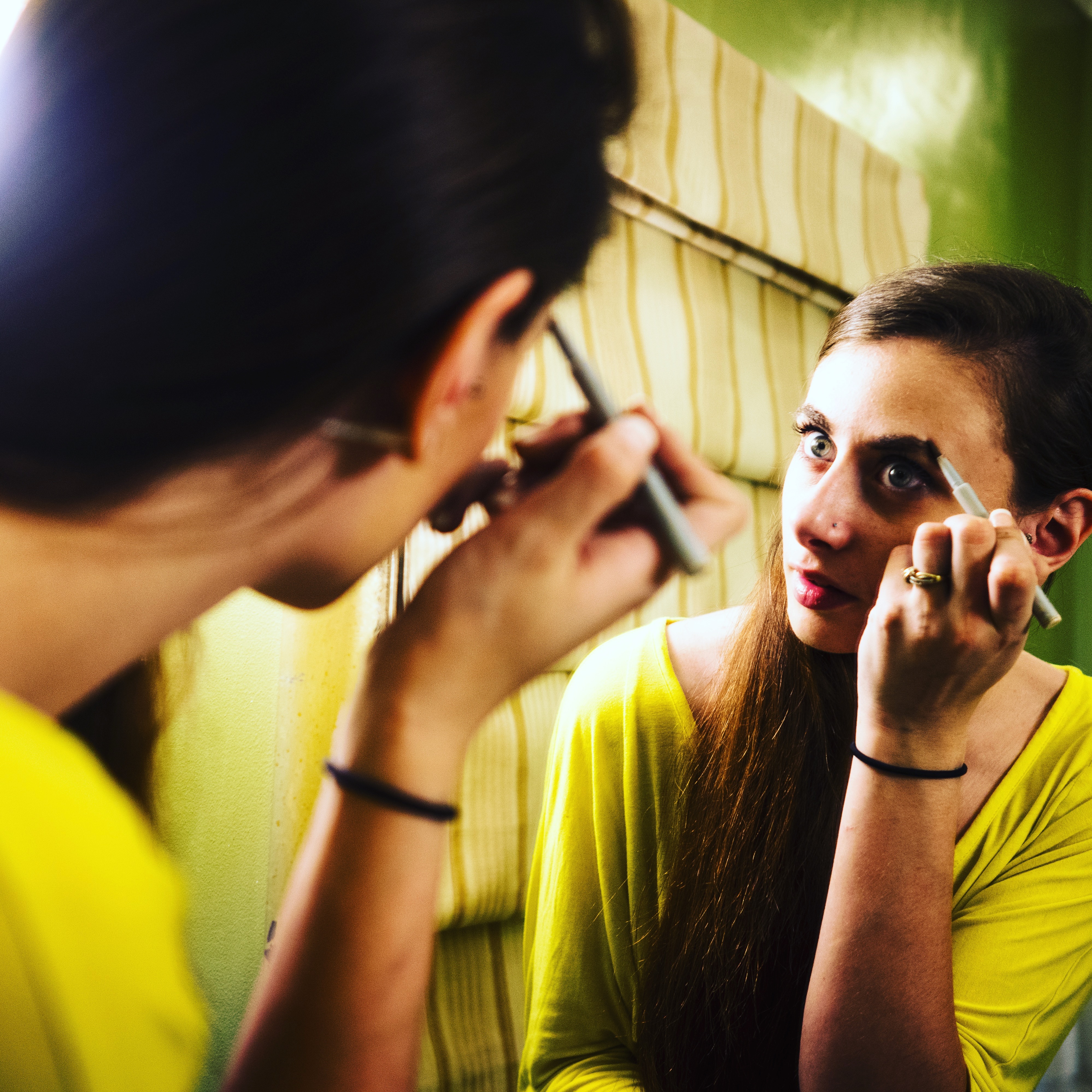 In a vibrant, green-hued room, a woman carefully applies makeup in front of a mirror. The soft light highlights her focused expression, revealing a moment of personal transformation and self-care.