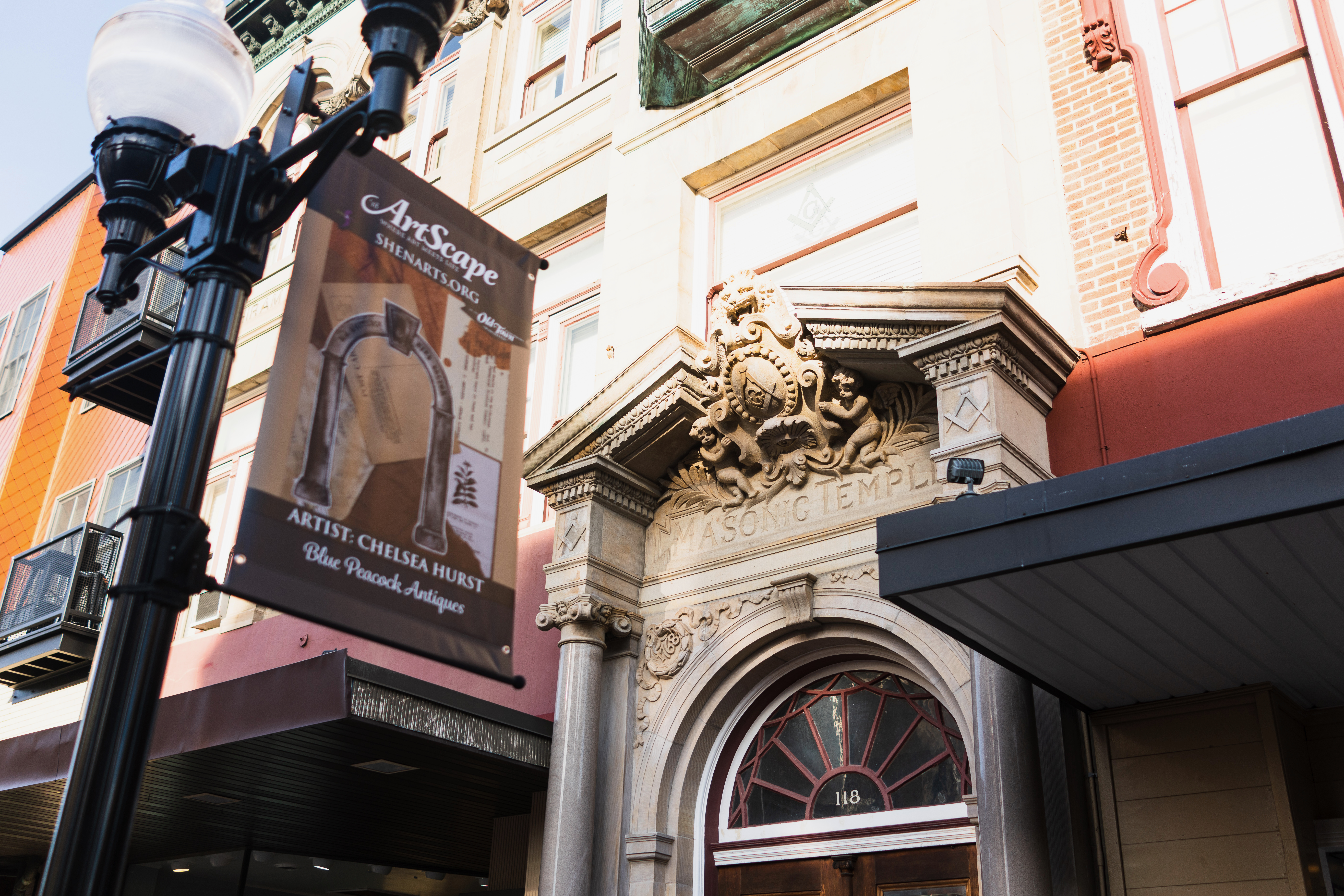 This photograph showcases the ornate façade of a historic masonry building, highlighted by intricate details and grand entrance. Strong sunlight casts dynamic shadows, creating a vibrant contrast between the architectural textures and the bright colors of surrounding storefronts. The presence of an art display banner adds a contemporary touch, bridging the past with the present in a lively urban setting.