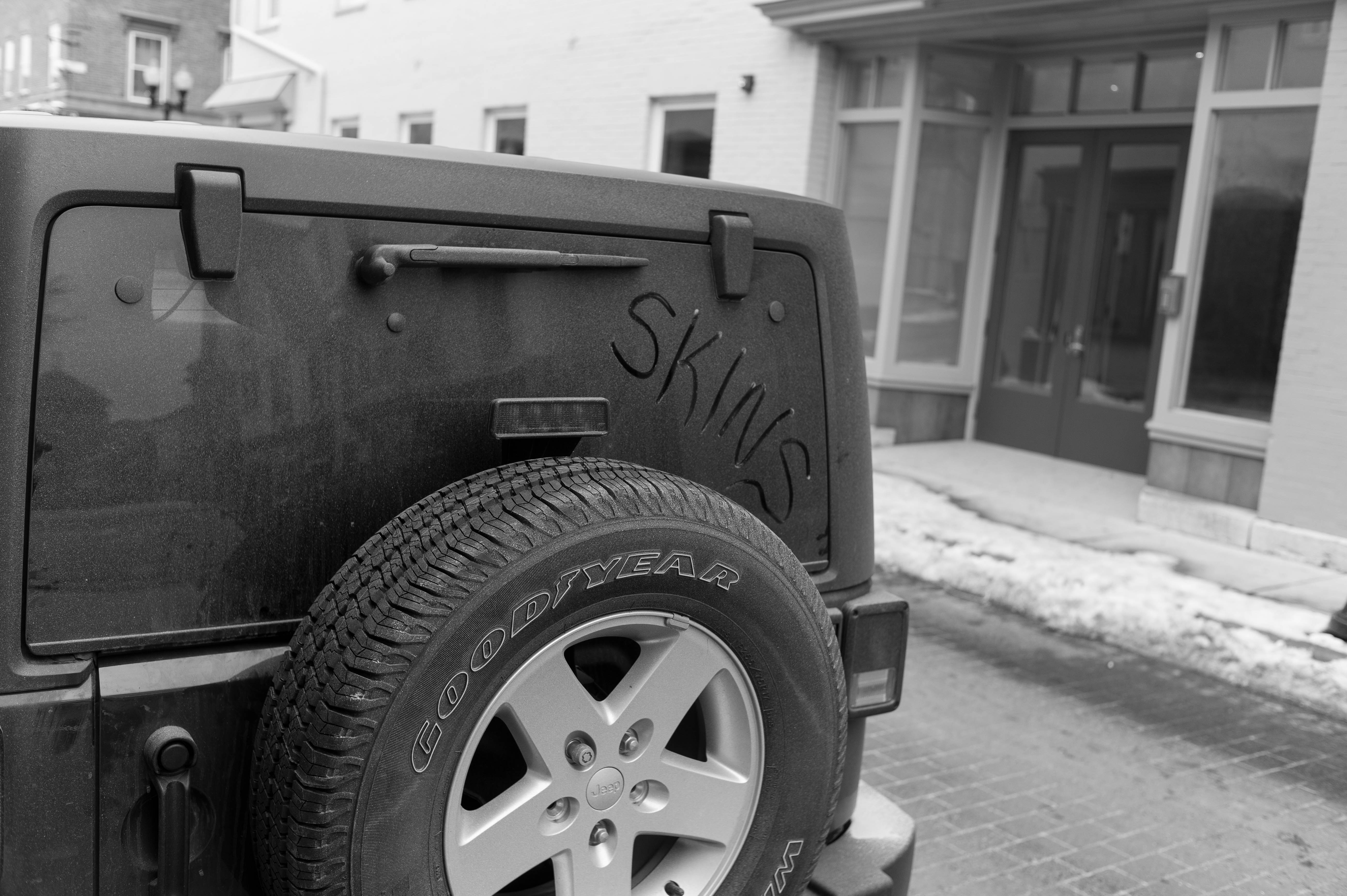 This photograph captures the rear of a weathered black Jeep, its dusty surface prominently displaying the word "SKINS" etched in the grime. The stark black-and-white composition accentuates the rugged texture and urban atmosphere, evoking a sense of anonymity and quiet rebellion amidst a backdrop of muted architecture. Soft lighting enhances the gritty mood, inviting contemplation of the stories held within this urban scene.