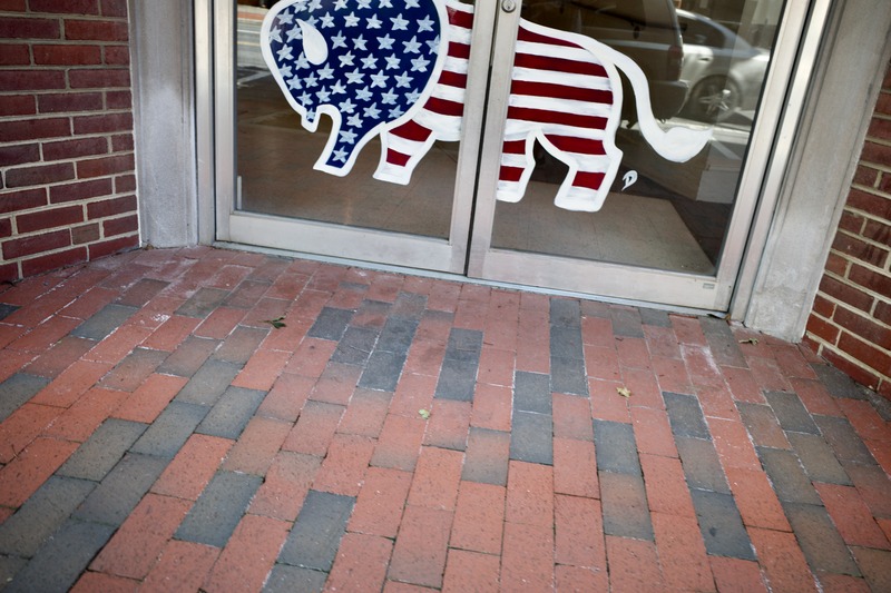 This photograph features a glass door adorned with a striking design of a bison, painted in red, white, and blue, evoking a sense of American pride. The warm, natural light casts subtle shadows on the textured brick walkway, enhancing the detail of the vibrant colors and the iconic imagery. The composition focuses on the entrance, inviting a sense of curiosity and connection to the local culture.