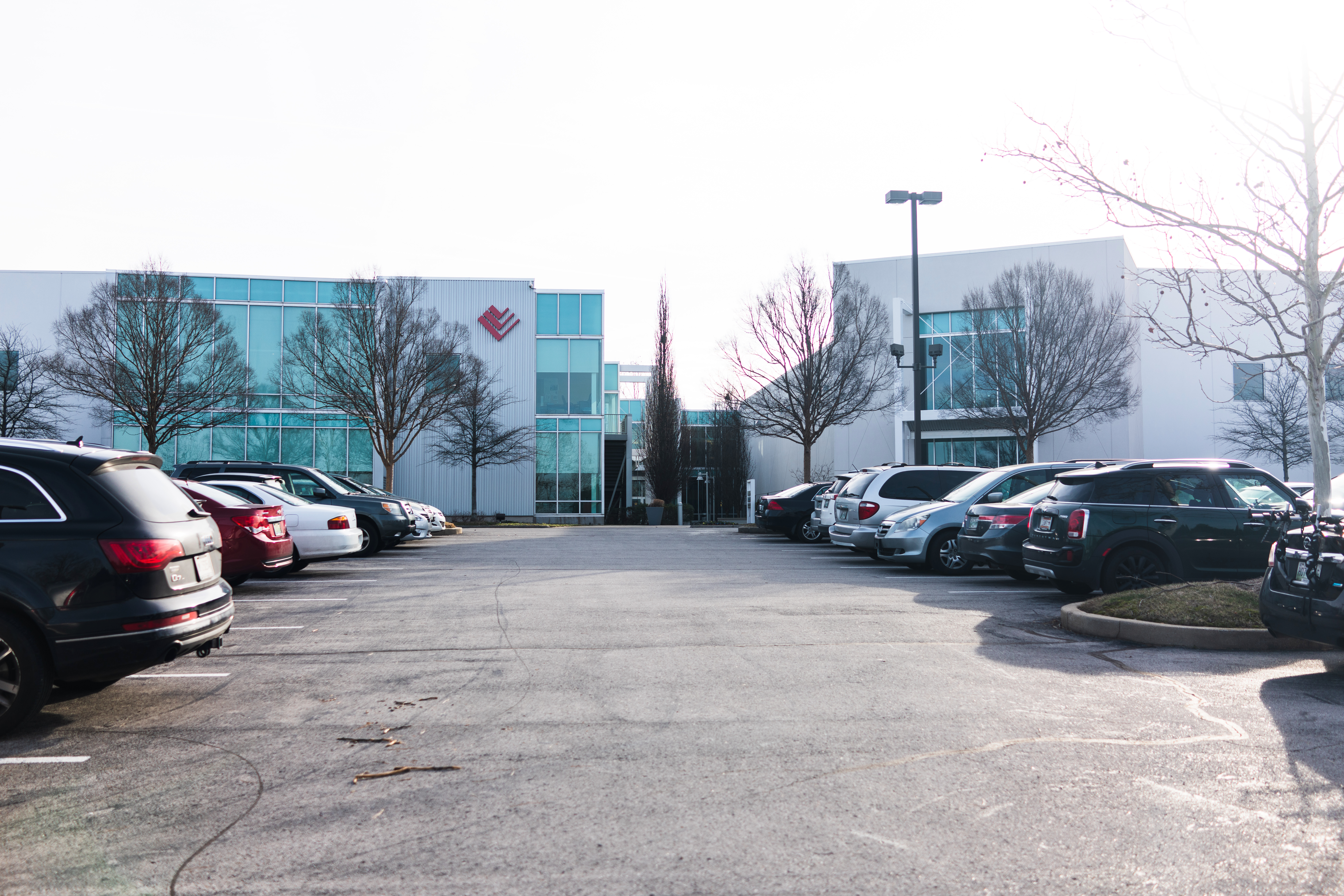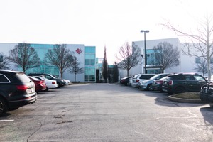 The photograph captures a serene corporate landscape, showcasing two modern buildings flanking a nearly empty parking lot. The muted lighting suggests a clear but chill day, while the symmetrical arrangement of vehicles creates a balanced composition, emphasizing the sleek architecture. Sparse trees add a touch of greenery, contributing to the tranquil yet industrial mood of the scene.
