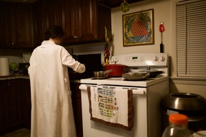 In a softly lit kitchen, a woman in a white robe stands by the stove, focused on her cooking. The warm, inviting glow of the ambient light contrasts with the sleek wooden cabinetry, enhancing the homely atmosphere. Various pots sit on the stove, reflecting a sense of domestic tranquility and the warmth of a shared meal preparations.
