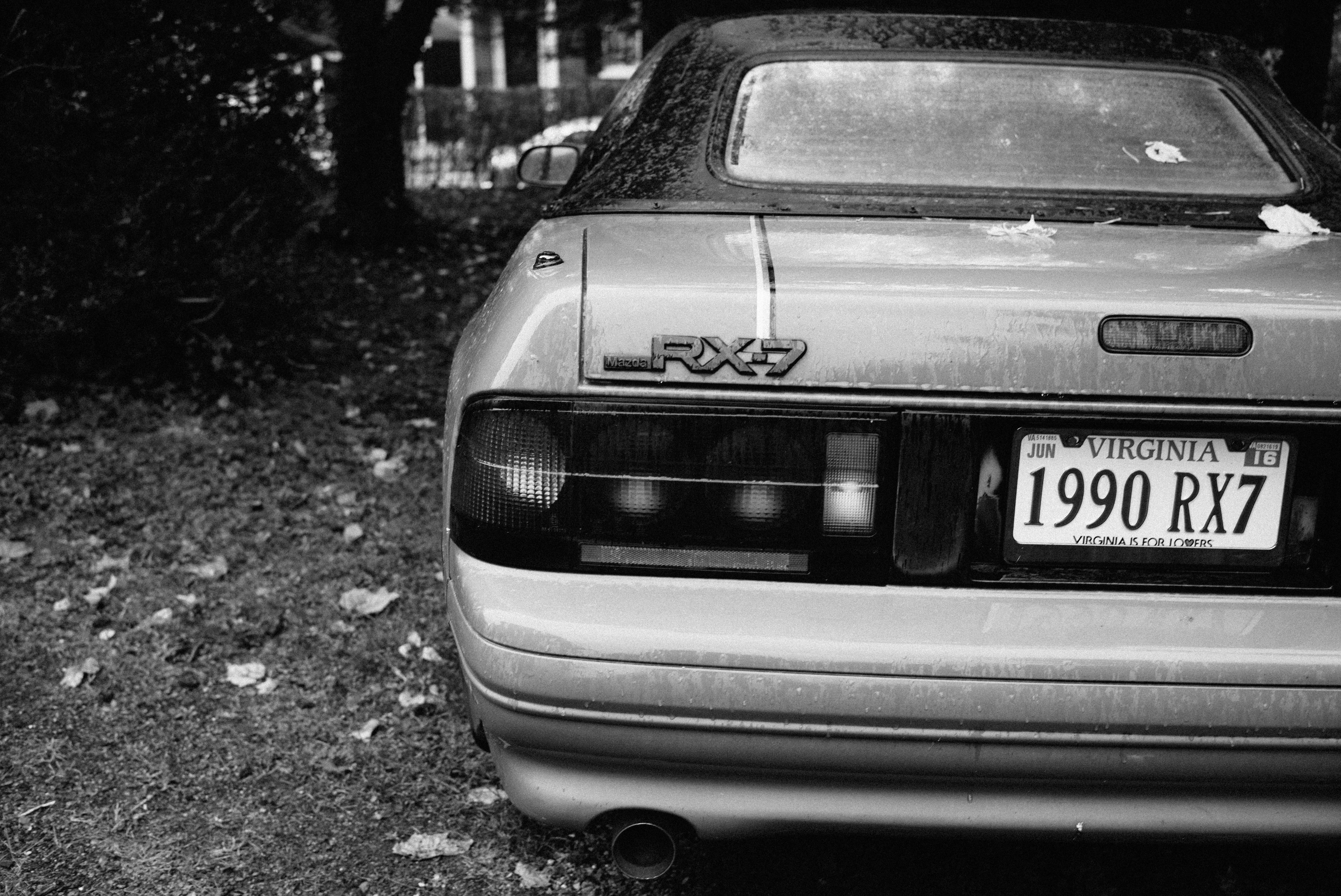 The photograph captures the rear view of a vintage RX-7, partially obscured by time and neglect. Its muted tones and rain-speckled surface evoke a sense of nostalgia, while the surrounding overgrown grass hints at stories untold. The composition emphasizes the car’s sleek lines, inviting reflection on a bygone era of automotive design.