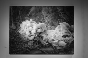 This striking monochrome artwork presents an otherworldly scene where abstract forms resembling soft, fleshy structures emerge from a textured natural environment. The interplay of shadow and light evokes a surreal mood, inviting contemplation of organic and ethereal qualities. Soft edges and fluid shapes enhance the piece’s dreamlike quality, making the viewer question the boundaries between reality and imagination.