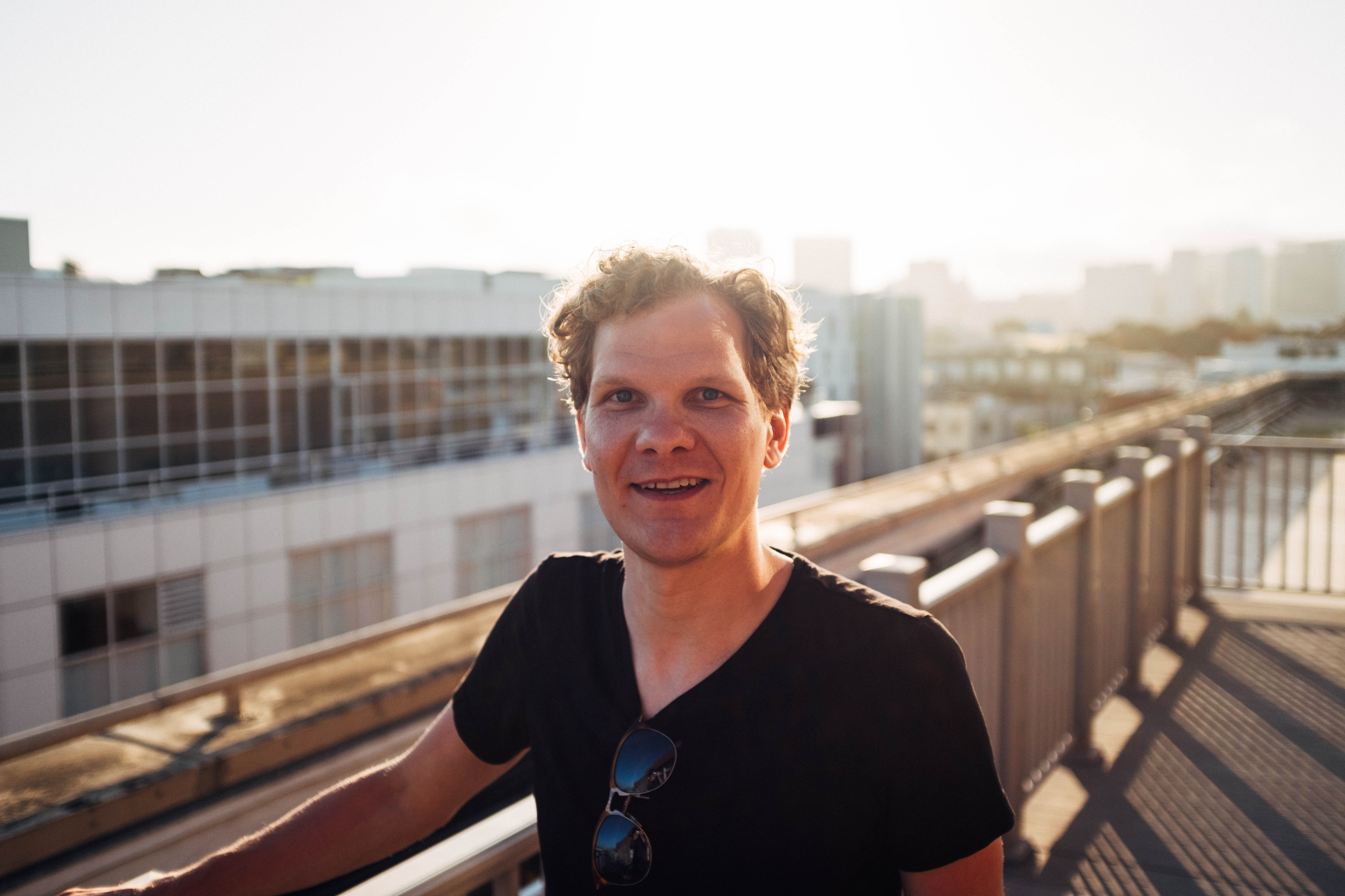 A man stands on a rooftop, bathed in warm golden light as the sun sets behind him, creating a radiant halo effect. His relaxed smile and casual attire convey a sense of ease, while the blurred cityscape in the background adds depth and context to the moment. The play of light and shadow enhances the cheerful atmosphere, inviting viewers into this joyful scene.