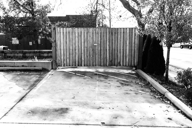 In this black-and-white photograph, a solitary, weathered wooden gate stands closed against a backdrop of a vacant, desolate parking area. The stark contrast and soft morning light create a melancholic mood, accentuated by scattered leaves on the pavement. Sparse vegetation and distant vehicles remind viewers of the urban setting, while the composition invites contemplation of solitude and stillness amidst city life.
