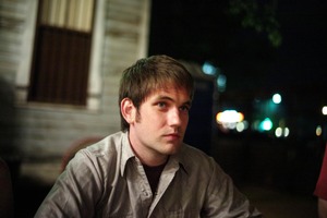 The photograph captures a young man seated in a dimly lit outdoor setting, lost in thought. With soft lighting that highlights his features and a blurred background of distant lights, the mood feels introspective and serene, inviting the viewer to ponder his reflections. His slight expression and the relaxed posture suggest a moment of quiet contemplation amidst the evening's ambiance.