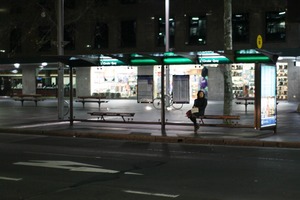 A lone figure sits quietly at a bus stop, illuminated by the soft glow of overhead lights. The atmosphere is contemplative, evoking a sense of solitude amidst the urban environment. The blurred background contrasts with the sharp focus on the subject, enhancing the feeling of isolation in a typically bustling city space after dark.