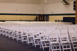 An expansive view of neatly arranged white chairs fills the gymnasium, casting a sense of calm anticipation. The soft lighting highlights the symmetry and order, evoking a mood of quiet expectation for the event to come. Empty and serene, the scene invites contemplation of the gatherings that will soon bring it to life.