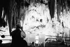 In a dimly lit cave, an elderly photographer stands in silhouette, intently focused on his surroundings. The striking formations of stalactites and stalagmites loom in the background, illuminated by soft, ethereal light that enhances the mood of wonder and exploration. Two empty plastic chairs suggest a moment of pause, amplifying the solitude and introspective nature of the scene.