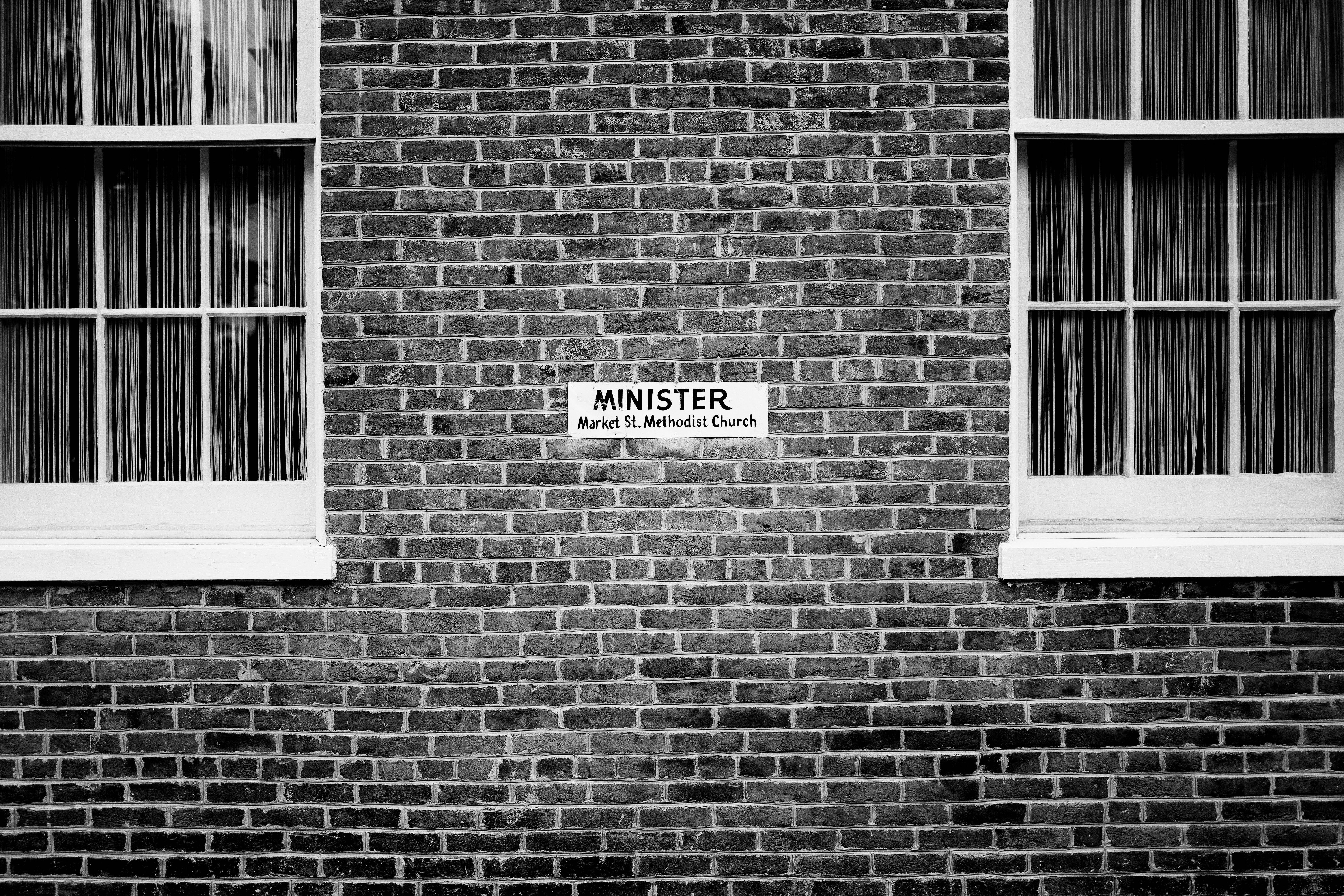 The photograph captures a weathered brick wall with a simple sign that reads "MINISTER" next to the window of the Market St. Methodist Church. The monochrome tones enhance the solemnity of the scene, evoking a sense of history and reflection. The composition draws the eye toward the sign, highlighting the interplay between architecture and spirituality.