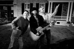 In this lively black-and-white photograph, three friends showcase their camaraderie and joy on a quiet street. With one strumming a guitar and the others playfully posing, they create a warm, upbeat atmosphere enhanced by the soft outdoor lighting. The composition captures their expressions—excitement and spontaneity—all against an intimate nighttime backdrop, evoking a sense of nostalgia and connection.