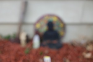 Bathed in soft, diffused lighting, this photograph captures a serene figure, likely a statue, surrounded by vibrant foliage and earthy tones. The composition conveys a sense of calm and introspection, inviting the viewer to ponder the peaceful essence of this sacred space. Blurred edges enhance the ethereal mood, creating a dreamlike quality that emphasizes meditation and tranquility.
