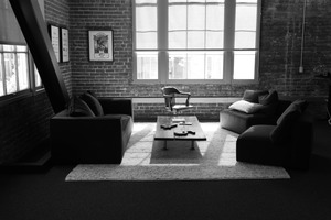 In this monochrome photograph, a minimalist living space radiates tranquility, framed by exposed brick walls and large windows. The arrangement of plush sofas and a simple coffee table creates a balanced composition, while soft afternoon light bathes the room, enhancing the serene mood. The contrasting textures of the carpet and furnishings contribute to an inviting yet sophisticated atmosphere.