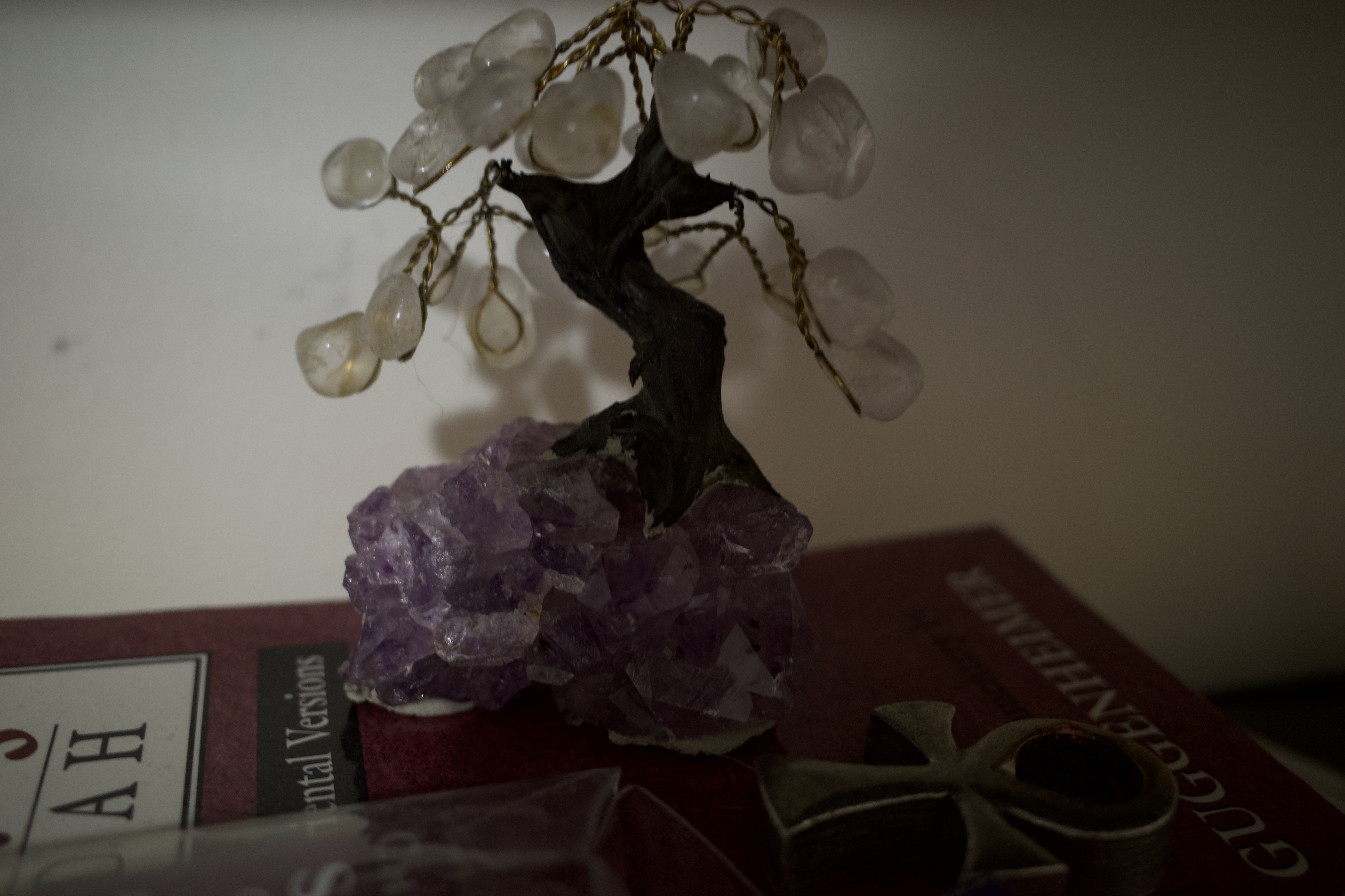 A delicate wire tree with crystal leaves sits atop a cluster of purple amethyst, emanating a sense of tranquility and elegance. The subdued lighting casts soft shadows, enhancing the intricate details of the tree while creating an intimate and serene atmosphere. In the background, hints of additional objects suggest a personal, contemplative space.