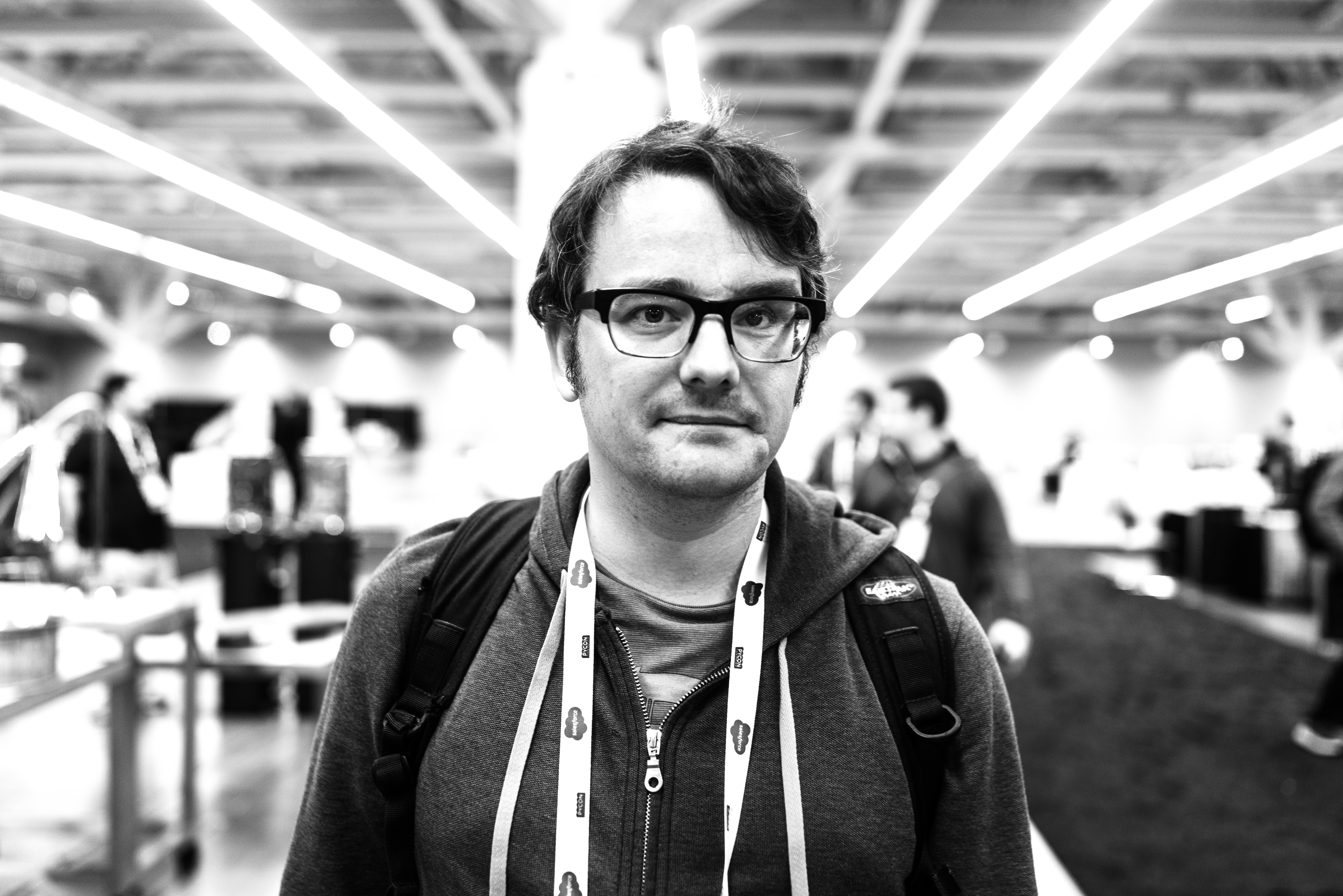 The photograph captures a contemplative figure amidst a bustling event, illuminated by stark, linear lighting that enhances the modernity of the setting. Dressed casually, the subject's expression reflects a mix of curiosity and introspection, standing out against a blurred backdrop of indistinct faces. The black-and-white composition amplifies the mood, evoking a sense of solitude within the collective experience of a dynamic environment.