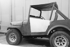 This photograph captures an old, rugged jeep, partially stripped of its components, resting in a muted urban backdrop. The monochrome palette enhances the vehicle's weathered texture, evoking a sense of nostalgia and adventure. Sunlight casts soft shadows, revealing the jeep's character while suggesting stories of exploration and freedom.