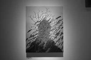 The artwork features a striking figure whose head transforms into a tangle of branches, evoking a deep connection between humanity and nature. The monochromatic palette enhances the mood, creating a somber yet contemplative atmosphere. Soft lighting highlights the intricate details, inviting viewers to explore the juxtaposition of human form and natural elements.
