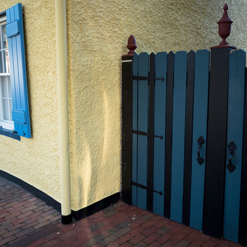 In this photograph, a vibrant yellow wall contrasts beautifully with a striking blue window and a darkly painted gate. The soft lighting casts gentle shadows, enhancing the textured surface of the wall and creating a warm, inviting atmosphere. The composition draws the eye toward the interplay of colors and shapes, evoking a sense of curiosity and charm.