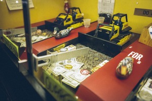 This photograph captures a nostalgic arcade game setup, featuring vibrant yellow toy bulldozers and an array of coins and bills spilling over a central compartment. The warm, dim lighting evokes a playful yet contemplative atmosphere, inviting memories of childhood amusement and the thrill of chasing after change. The mix of colors and textures, from the shiny coins to the distinct bill patterns, creates an engaging visual contrast that draws the viewer in.