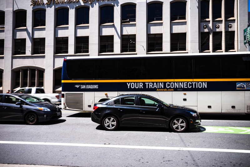 The photograph captures a bustling urban scene, where a sleek black car and a bus emblazoned with 'YOUR TRAIN CONNECTION' move side by side along a city street. The bright sunlight casts sharp shadows, accentuating the details of the vehicles and the historic architecture in the backdrop, evoking a sense of dynamic movement and connectivity. The composition highlights the intersection of road travel and rail transport, symbolizing a city in motion.
